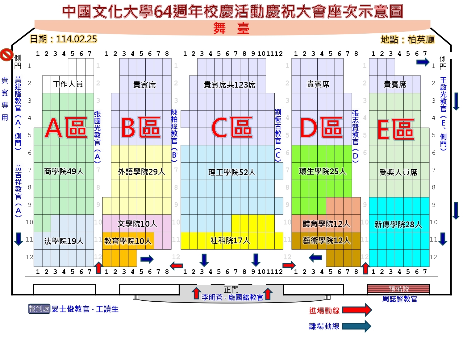 1、請觀禮同學攜帶學生證以利刷卡簽到作業,也請記得簽統計學課堂的簽到單 2、公關室備有紀念品發放,於報到刷卡簽到時一併簽領紀念品兌換卷,但數量有限,先到先領,發完為止。 3、觀禮學生人數略有異動,將依明日大會現場狀況機動調整座位